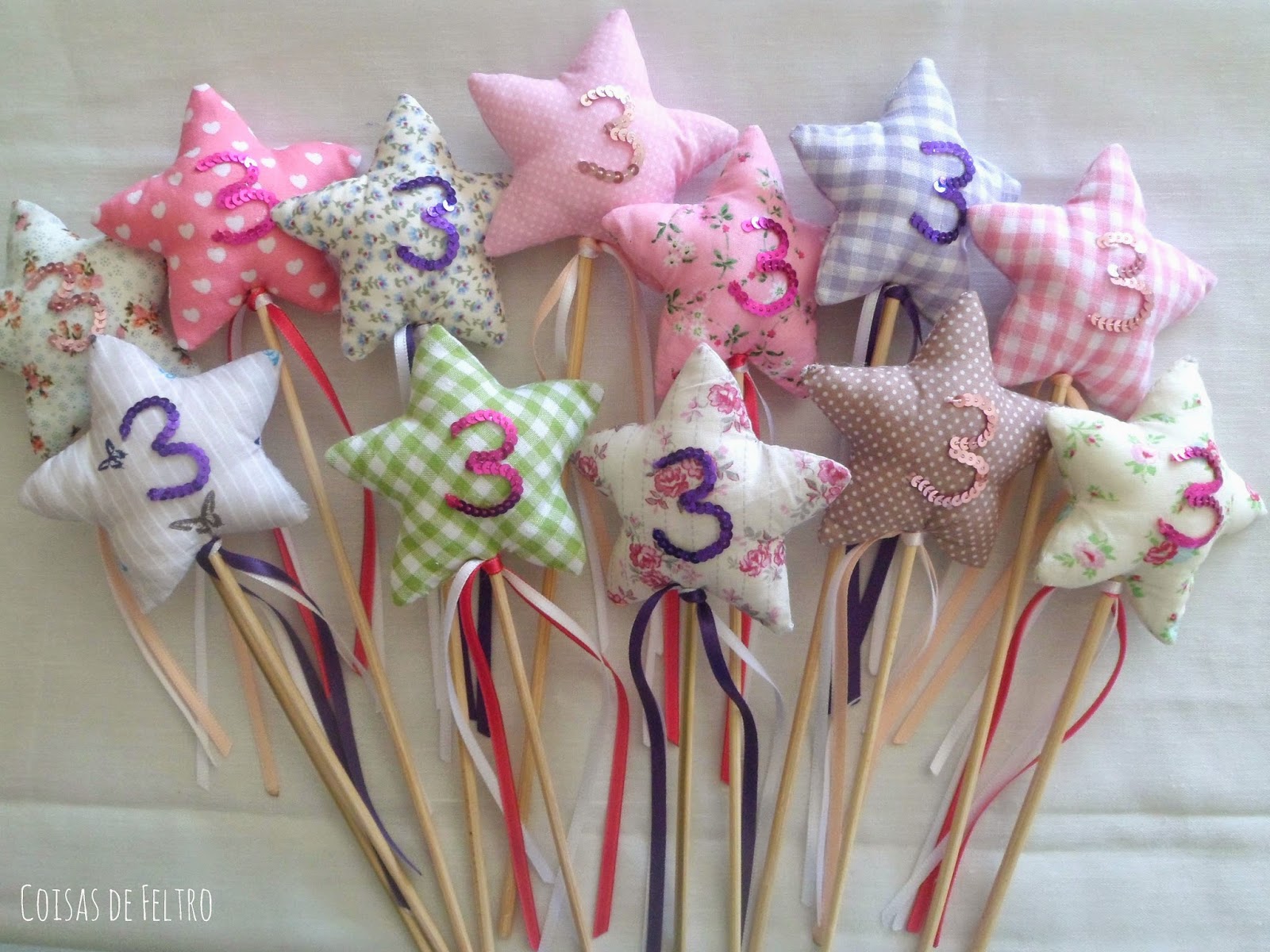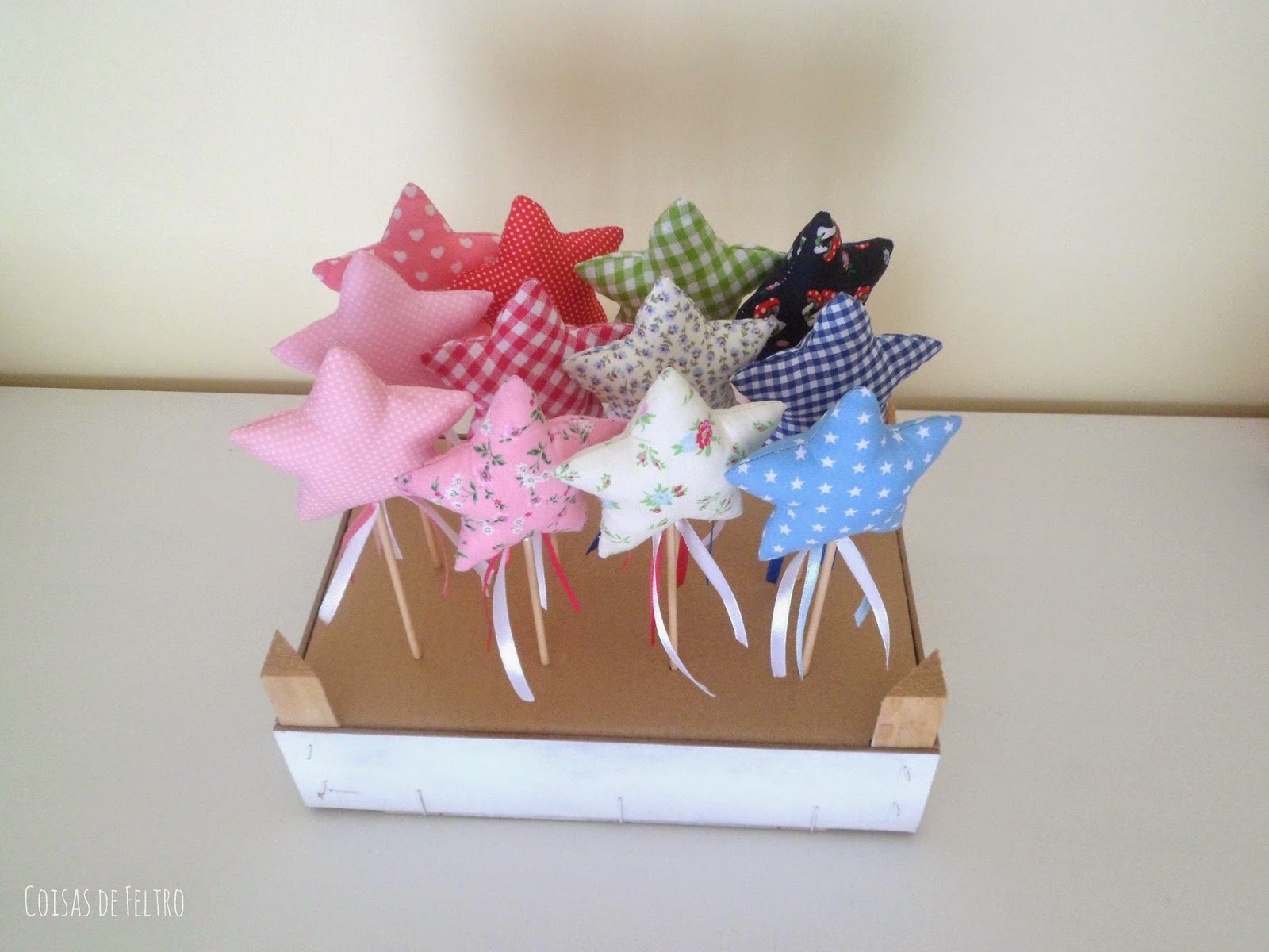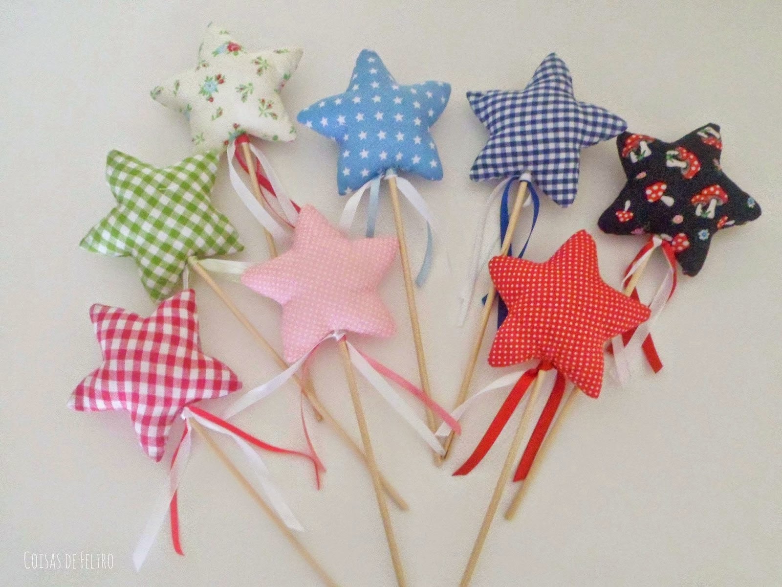 Estas varinhas com estrela servem para enfeitar uma jarra, um vaso, alegrar um cantinho qualquer. Podem até servir como lembrança de aniversário para os convidados.